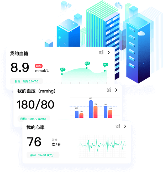 健康模塊,飽含血糖、血壓、尿酸、心率以及運動健康指數(shù),為用戶提供數(shù)據(jù)云儲存、健康預(yù)警。系統(tǒng)還可根據(jù)用戶平時的檢測指數(shù),運算出健康目標(biāo)值